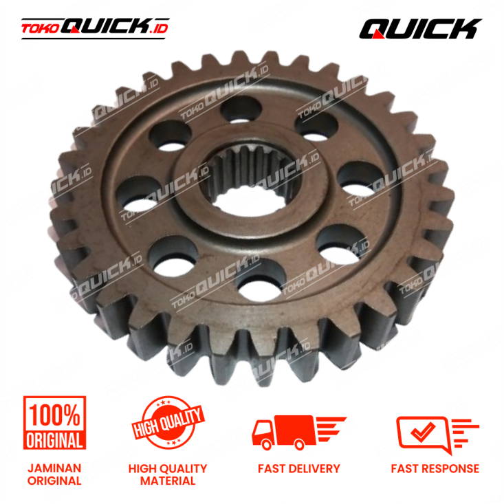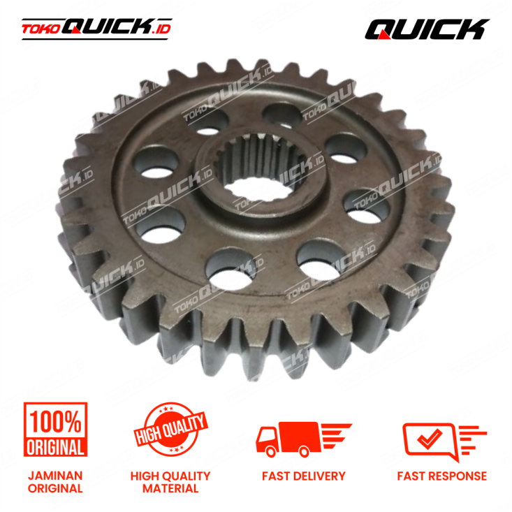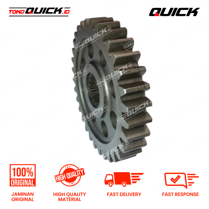 Gear 33T digunakan dalam sistem transmisi QT-16 untuk mentransfer tenaga putar dari poros penggerak ke komponen lainnya. Gigi dirancang dengan profil presisi untuk mengurangi kehilangan energi akibat gesekan. Diproduksi menggunakan baja paduan melalui proses hardening untuk ketahanan maksimal terhadap aus dan keausan gigi. Memberikan transmisi tenaga yang stabil dan efisien.