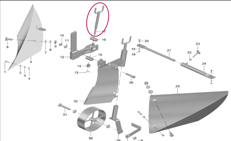 Baut penyetel model "T" untuk mengatur posisi dan sudut bajak agar hasil pembalikan tanah lebih optimal.